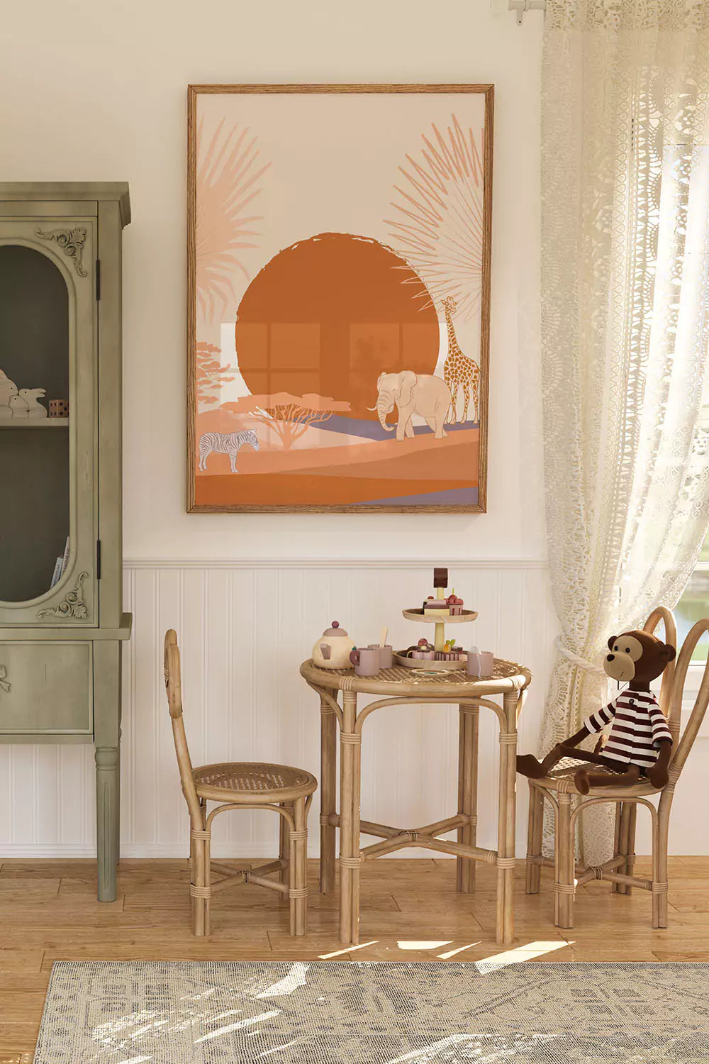 Plongez dans le monde enchanteur de 'Wild World' – où les tons bohèmes dessinent une toile de magie et d'aventure pour les petits. Chaque pièce de cette collection offre un aperçu captivant de la nature sauvage, idéal pour les chambres d'enfants et au-delà. C'est un cadeau qui éveille la curiosité et apporte la beauté de la nature à l'intérieur. Avec une palette de couleurs safari vibrantes et des animaux sereins, cette impression transforme n'importe quelle pièce en un captivant coucher de soleil de safari.